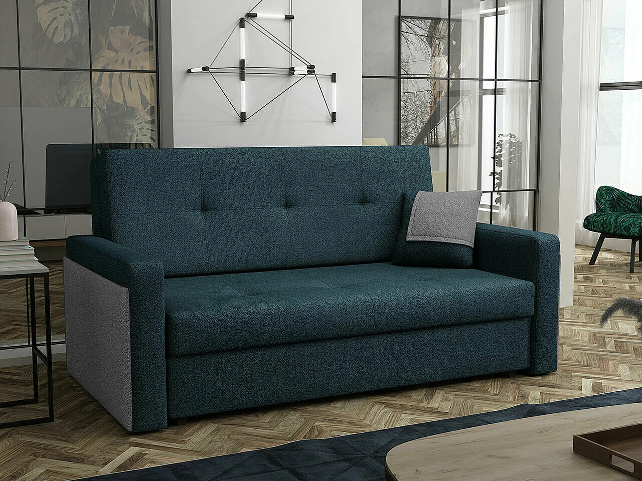 Les pieds en métal élégants soulignent la simplicité d'exécution et la modernité, ce qui signifie que ce modèle s'adapte aussi bien aux intérieurs traditionnels qu'aux intérieurs légèrement originaux. La fonction de sommeil mentionnée mesure jusqu'à 120x190 cm.